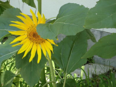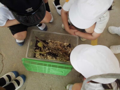 1年生が生活科で夏の生き物や植物探しをしていました。ショウリョウバッタを見つけてみんなで観察していました。地域の方からいただいたカブトムシも成虫になりました。環境委員会がお世話しているひまわりも花がさきました。