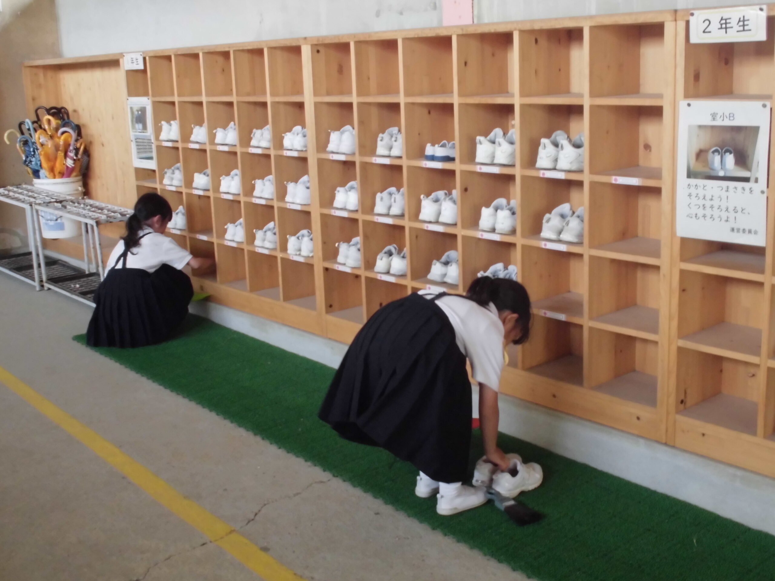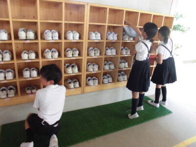 係の仕事頑張っています。 学校生活 2025.07.01 給食の準備の時間、給食当番が給食の準備を頑張ってくれています。その時間を活用して、係の仕事として靴箱の掃除をしている学年があります。3年生の仕事の仕方を見て、1年生が頑張っている姿が微笑ましいです。チャレンジ目標である室小Bを意識してくれています。