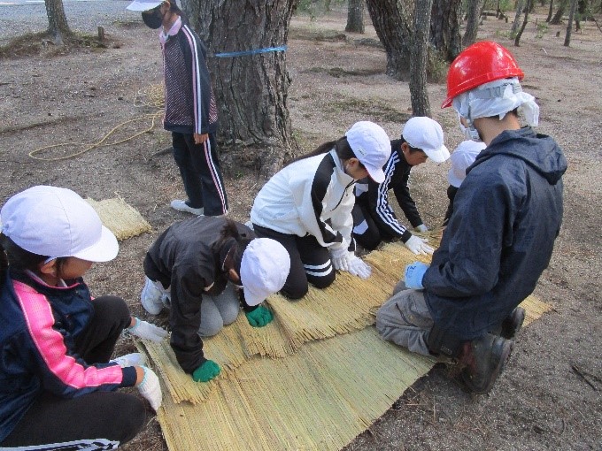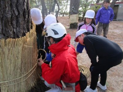 室積海岸の松にこもを巻いたよ ~4年生こも巻き体験~ 学校生活 2025.11.11 4年生が、室積海岸に出かけ、松林の松にこもを巻きました。はじめに、こも巻きについての説明を聞き、その後、巻き方を教えていただいてからこもを巻きました。むしろを折ったり、縄でしばったり、グループで協力して行うことができました。室積の伝統的な風物詩に触れることのできた秋の午後となりました。