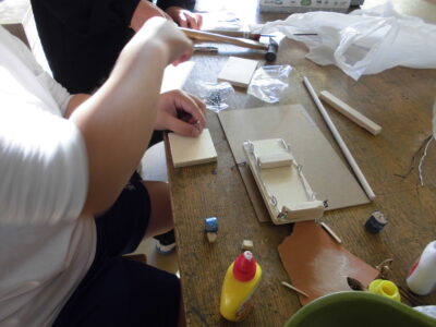 何ができるのかなあ ~ 6年生 木や金属を使って ~ 学校生活 2025.12.05 6校時、トントン、トントンと工作室から、聞き慣れない音が聞こえてきました。のぞいてみると6年生が、木や金属を使って、いろいろな作品を作っていました。金づちやのこぎりの使い方に苦戦しながらも、楽しそうに取り組んでいました。どんな作品ができあがるのか楽しみです。
