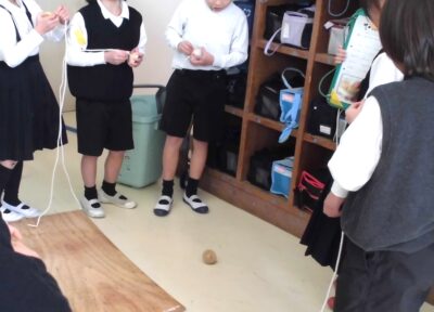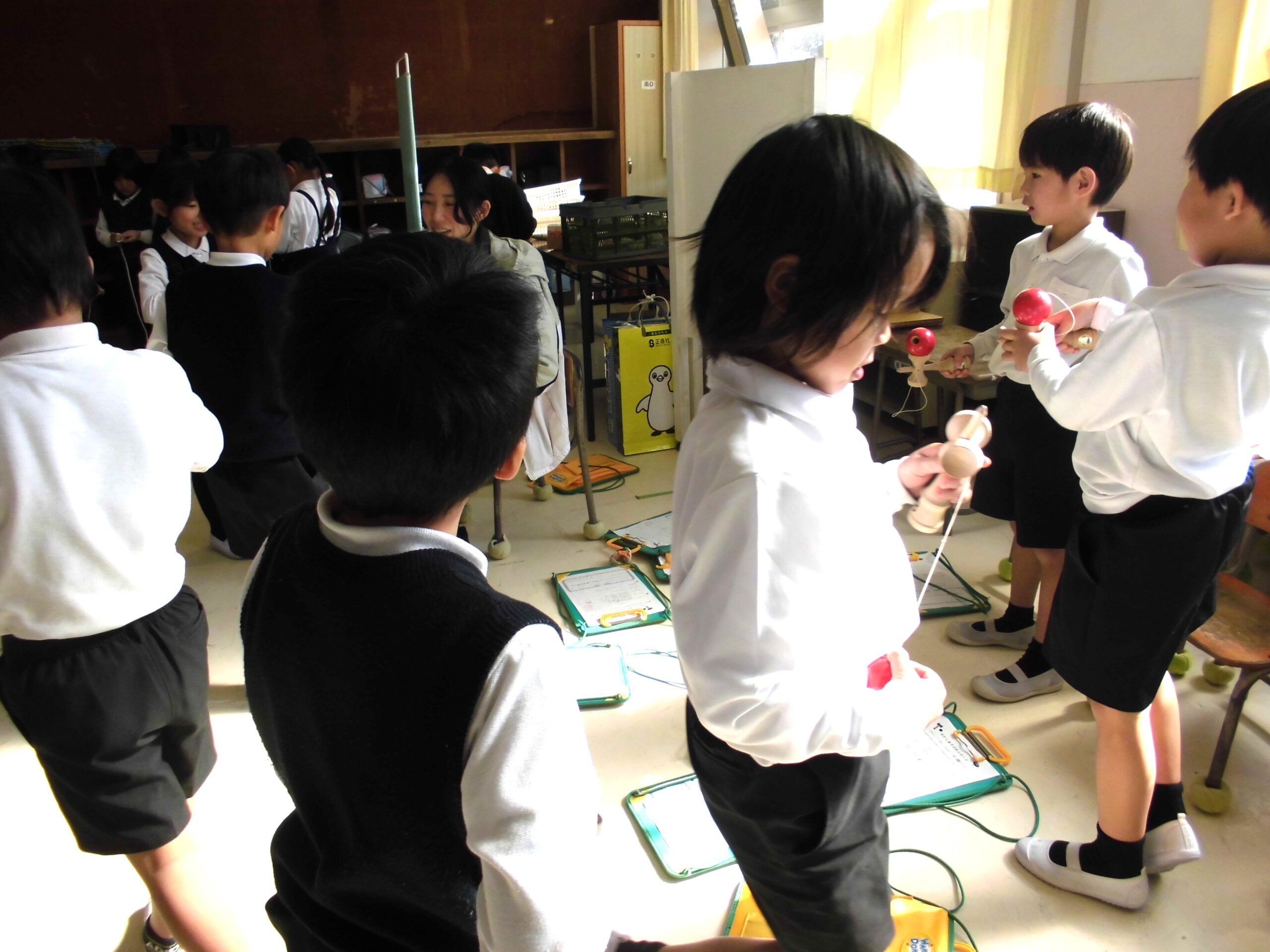 上手になりました。~ 昔の遊び 1年生 ~ 学校生活 2026.02.09 1月21日にわいわいサロンの皆さんに1年生が昔の遊びを教えていただきました。1年生は教えていただいたことをもとに、生活科の学習でずっと練習をしてきました。教えていただいたことを思い出しながら、みんなで協力して練習に取り組んでいます。けん玉やコマ回し、お手玉など、とても上手になっています。