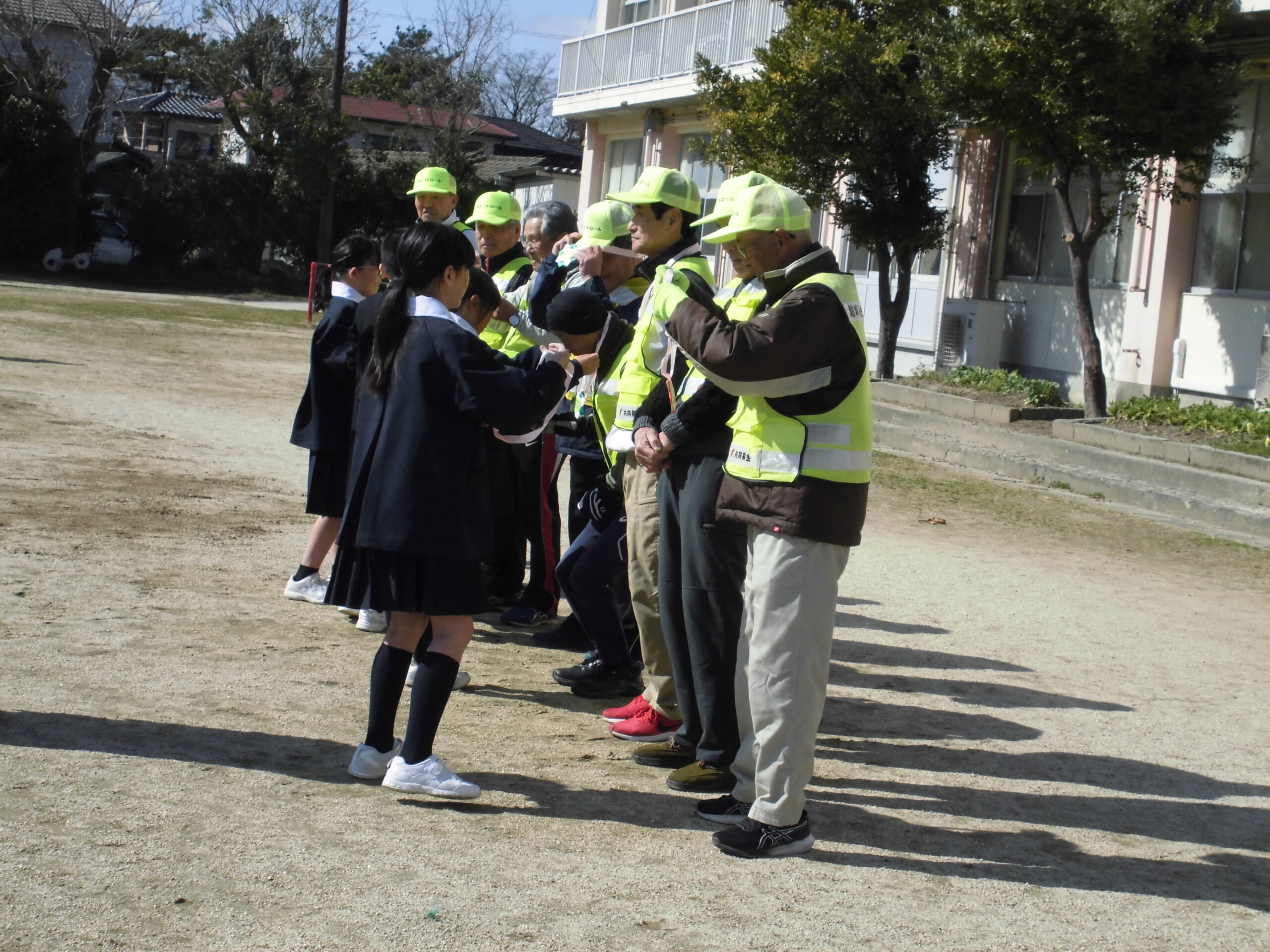 今年度最後の一斉下校でした。いつもお世話になっている見守り隊の皆さんにお礼の会を開きました。今年度一年間、安全に元気に登下校できたのも見守り隊の方々のおかげです。みんなで感謝を伝えました。
